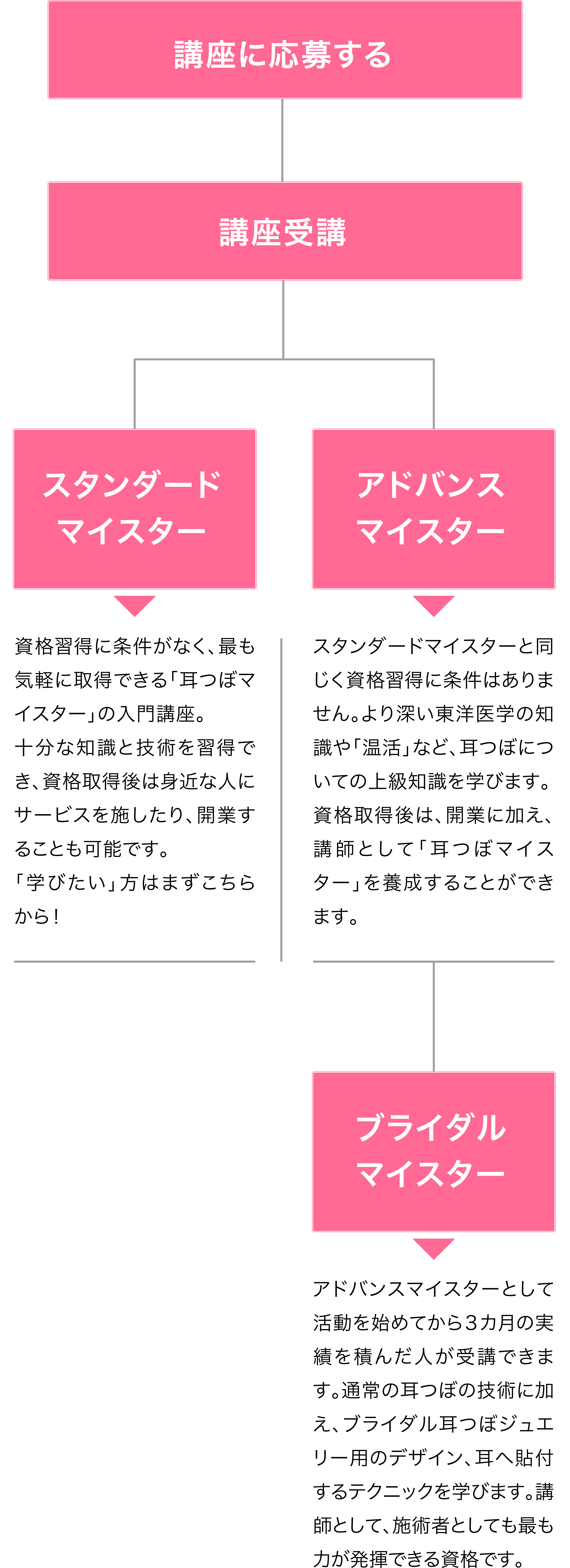 資格取得までの流れ イベント情報・受講料 協会認定資格講座コース紹介 ブライダル耳つぼジュエリー®の施術法や、サロンを開業するための 協会資格等を取得できる講座となります。 講座に応募する お近くの講師をさがす